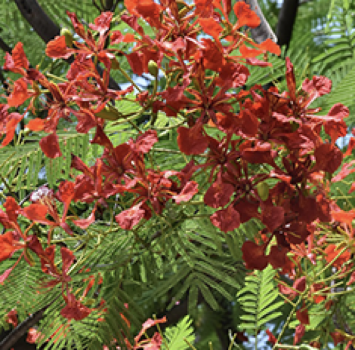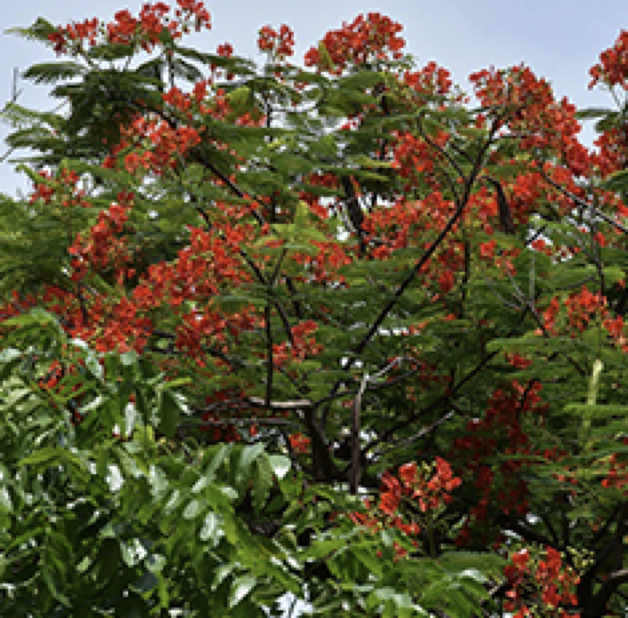 As I stand below this tree early in the day, soaking its bright colour and infectious energy, I remember American poet George E. Merrick’s beautiful lines from his poem,’ The Royal Poinciana in Bloom’. Written in 1920 in Florida, the poems evokes the image and the sentiment of this beloved tree so vividly, so universally.