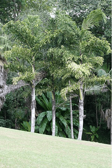meters and widths of 30 centimetres. The grey trunk is adorned with distinct leaf-scar rings, culminating in a magnificent leaf crown spanning 6 meters in both width and height. Vibrant green, triangular bipinnate leaves can grow up to 3.5 meters in length, attached to 60-centimeter-long petioles with pointed and jagged edges.
