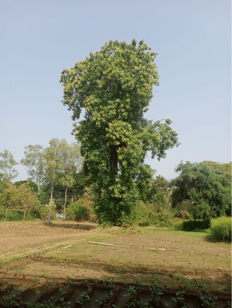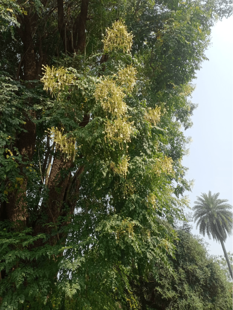 In a quiet corner of my heavily wooded home’s backyard, it stands amidst a sea of humble bushes and unassuming grasses: solitary, stately and magnificent. This remarkable specimen of nature’s grace is adorned with clusters of ivory flowers that shimmer like silver in the sunlight. As you approach, the air is filled with an intoxicating fragrance, a sensory delight that lures you closer. On a moon lit night, the white carpet of delicate flowers that the tree sheds in abundance create a surreal sight, soothing, mesmerising.